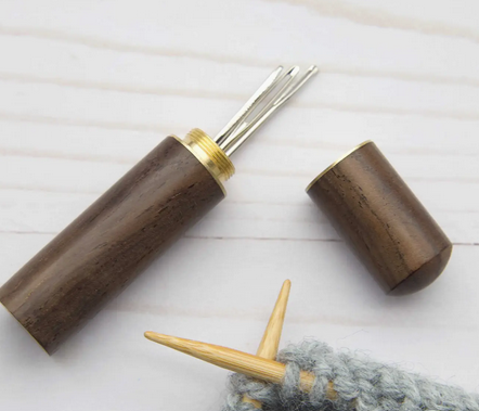 These wood, screw top cases are a beautiful way to store your sewing up needles. The case comes with 3 needles, one for sock weight yarn and the other two for heavier yarns.